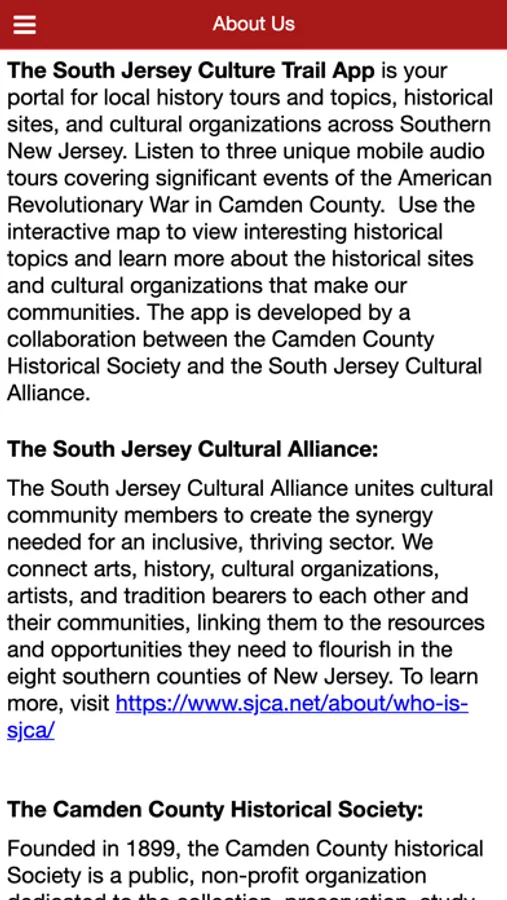 The South Jersey Culture Trail is your portal for local history tours and topics, historical sites, and cultural organizations across Southern New Jersey. Listen to three unique mobile audio tours covering significant events of the American Revolutionary War in Camden County. Use the interactive map to view interesting historical topics and learn more about the historical sites and cultural organizations that make our communities. The app is developed by a collaboration between the Camden County Historical Society and the South Jersey Cultural Alliance.