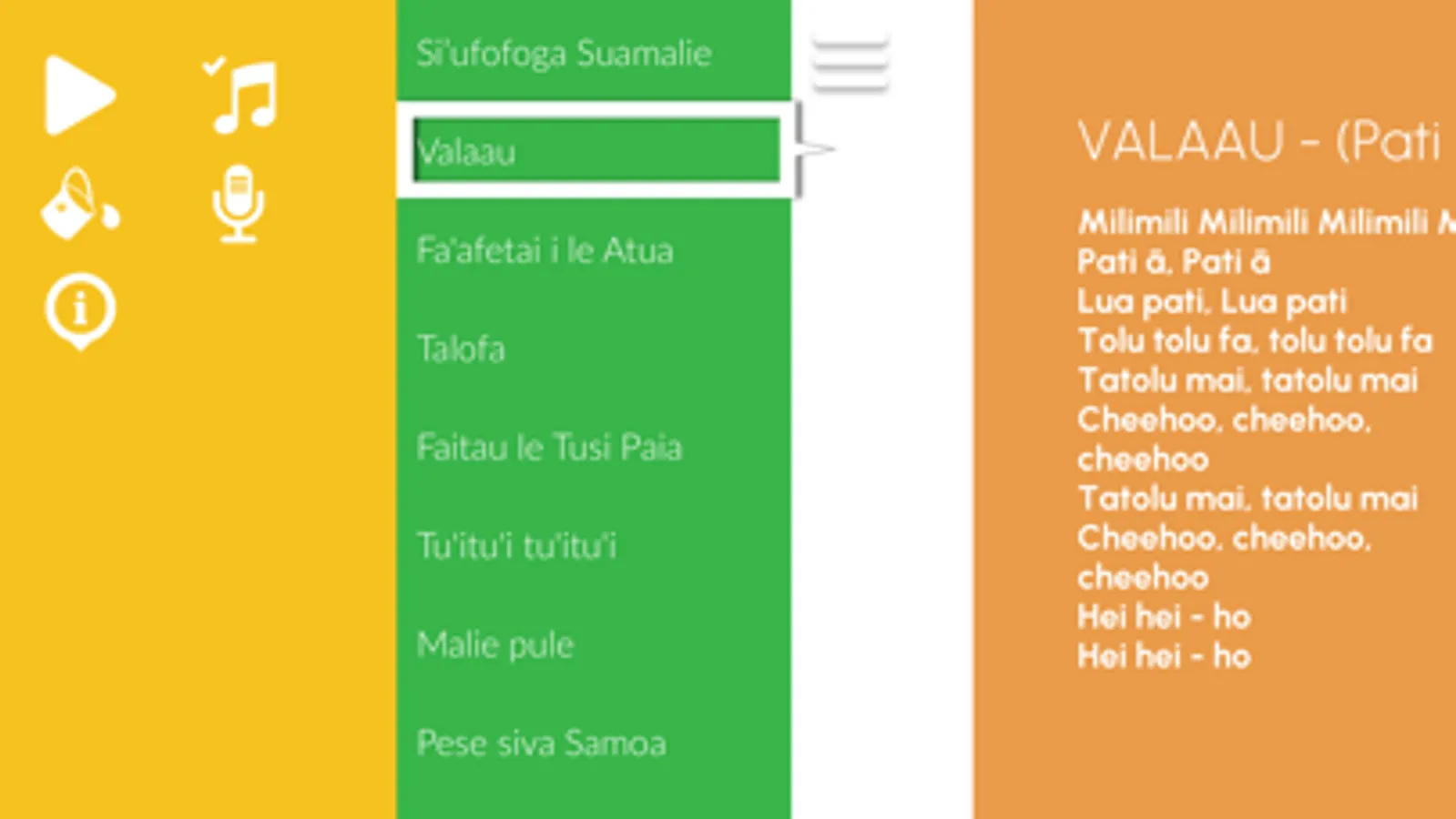 Listen to the captivating vocal skills of our children sing traditional and original songs as you open the app. Explore the magical culture of Samoa with imagery that reflects each song. Sing along karaoke-style in Samoan as each word highlights.