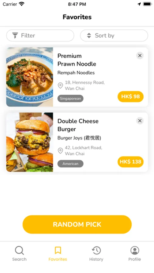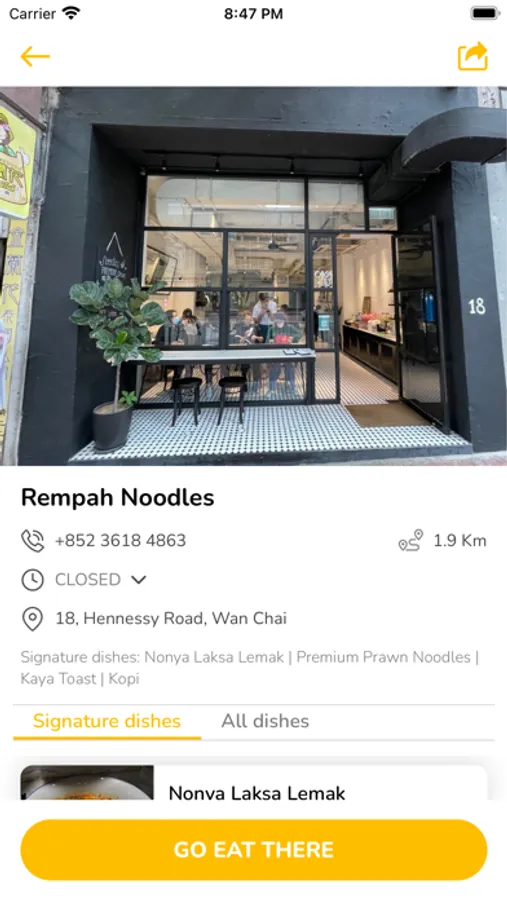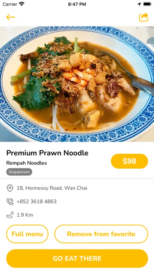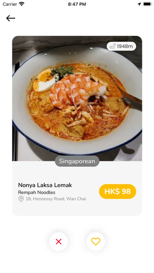 - 附近餐廳嘅招牌菜一個一個咁顯示喺你面前。好似交友App咁,唔鍾意就向左Slide ignore;鍾意就向右Slide,哩味餸就會加入到你嘅收藏單裡面。