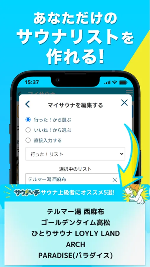 自分のお気に入りやオススメなど、好きなようにカスタムできるサウナリストを作れます。Twitterと連動してツイートも可能!
