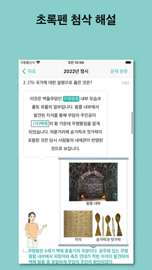 작은 화면에서 장황하게 표시되는 해설 방식을 지양하고 설명이 필요한 부분에 곧바로 초록색 펜으로 해설을 보여 줍니다.