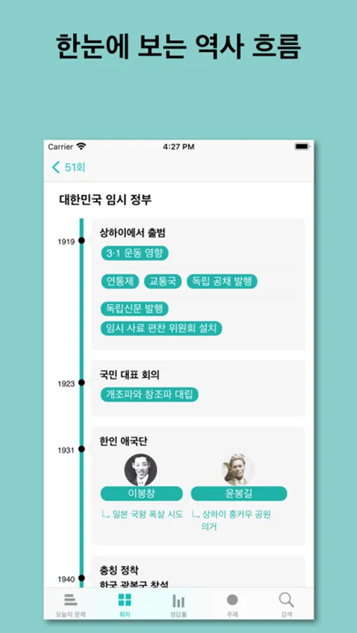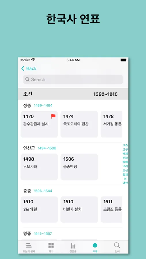 역사의 흐름을 한눈에 파악할 수 있는 요점 정리 화면을 제공합니다.