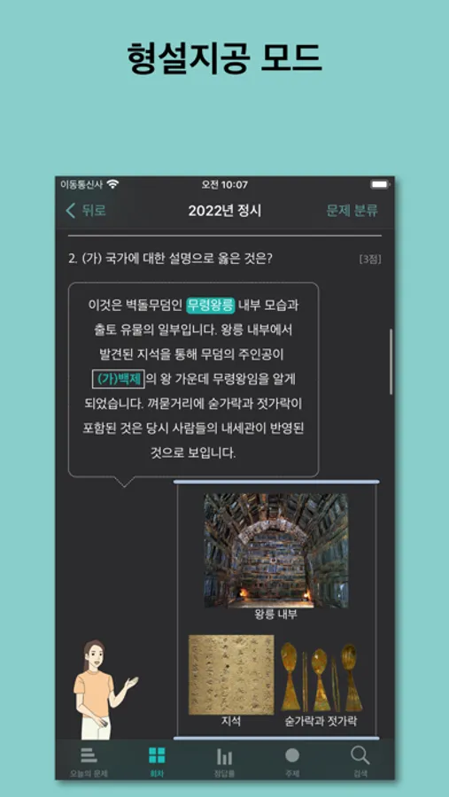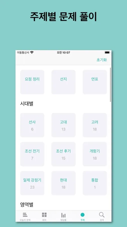 시대별 영역별 주제별 문제 풀이는 물론 특정 키워드별로 분류된 문제들만 따로 풀 수 있도록 체계화했습니다.