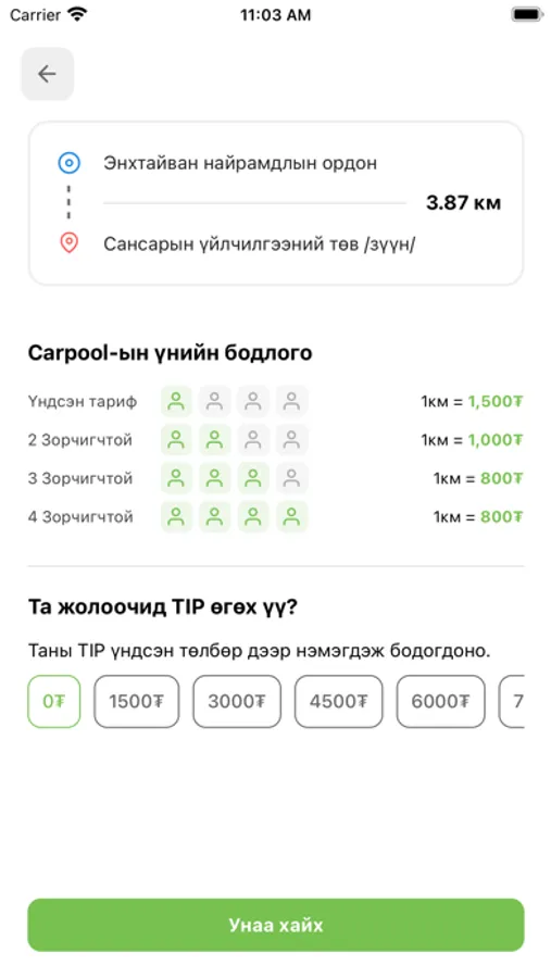 - Таны зорчиж буй машинд ижил эсвэл ойролцоо зүгт зорчигч нэмэгдэх бүрд таны км-ийн төлбөр 1 км нь 800 ₮ хүртэл буурах боломжтой.