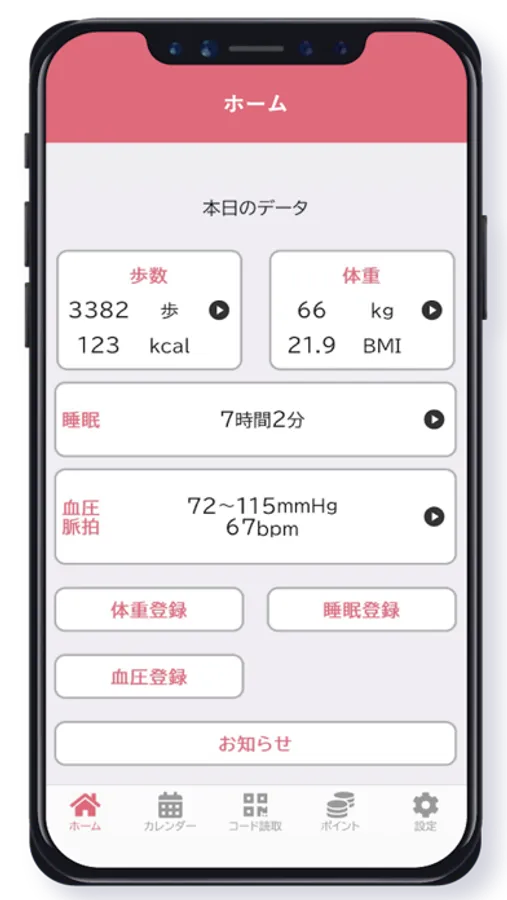 (歩数・体重・睡眠時間・血圧/脈拍・消費カロリー・BMI)