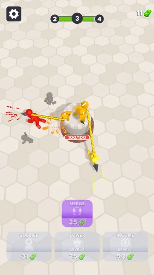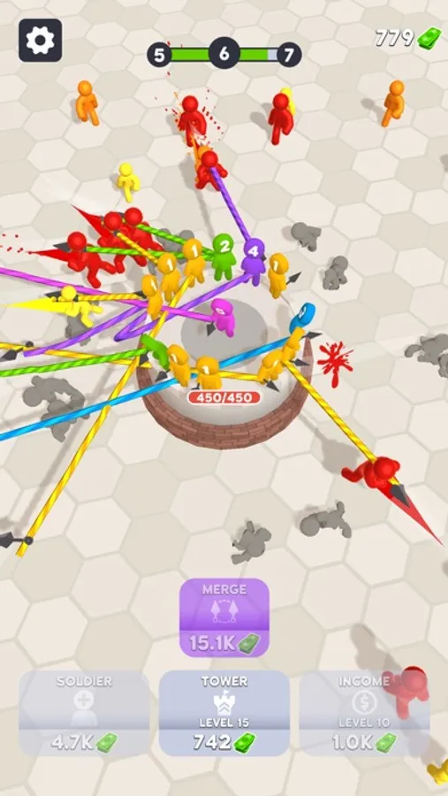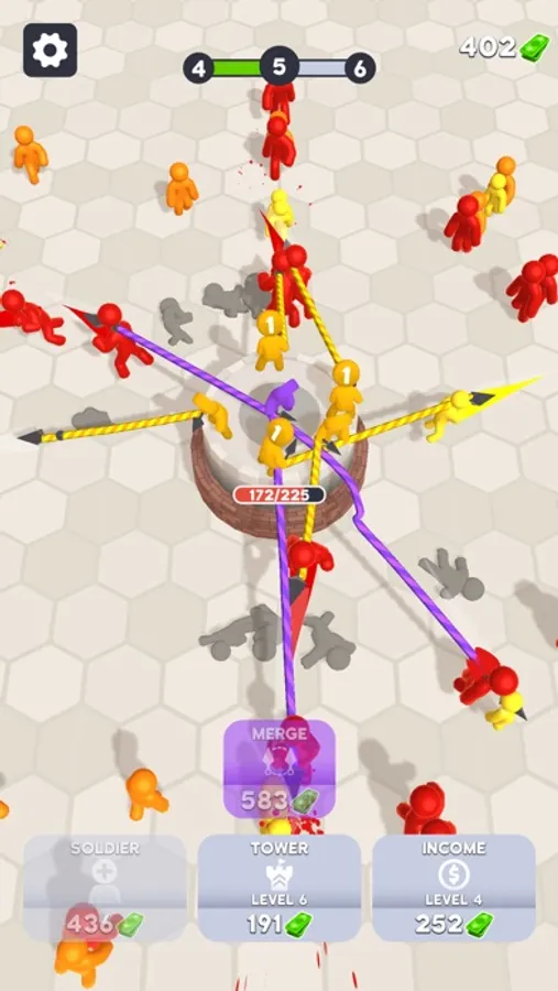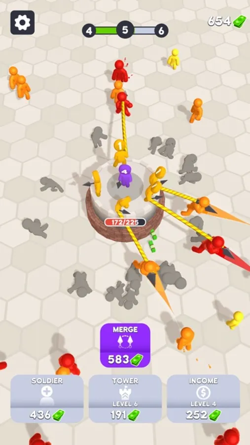 To defeat the enemies, use your ropes. Upgrade your base, buy new soldiers and merge them.