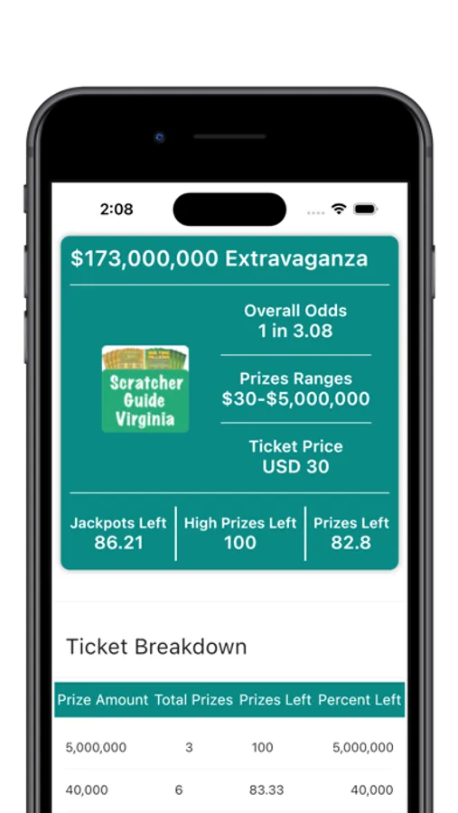 - View statistics for each game like the jackpot amount, ticket cost, number of jackpots remaining, and more!