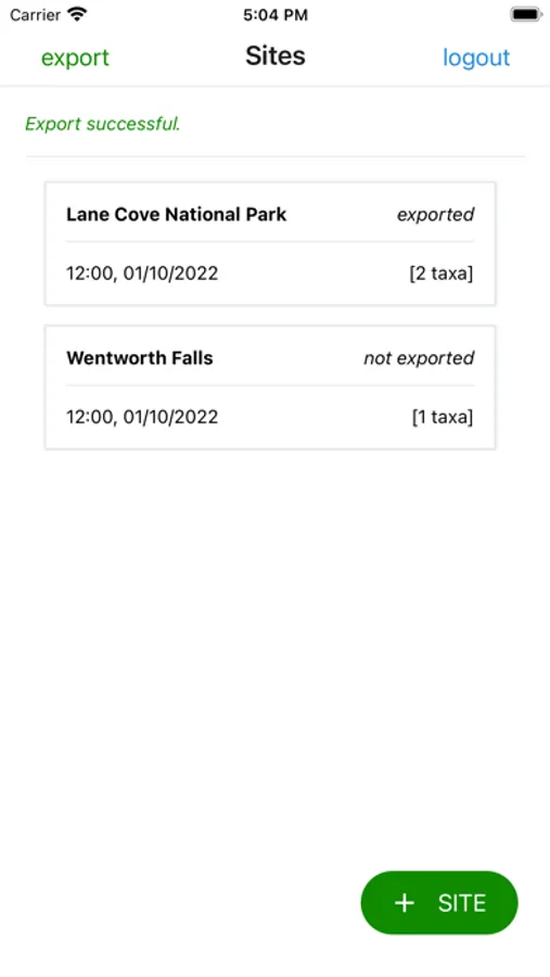 On export, all data will be sent to the email entered at login as two separate CSVs – one for sites, and one for samples.