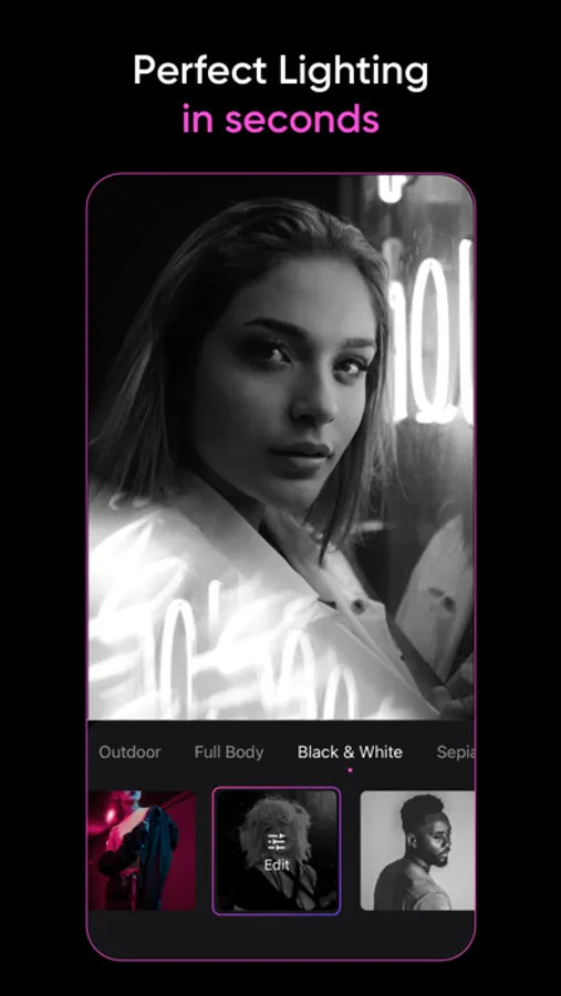 With Relight, you can have THE perfect lighting with ready-made studio light presets only in seconds. It is possible to select between a wide range of different lighting effects, together with the ability to adjust contrast, exposure, color and intensity.