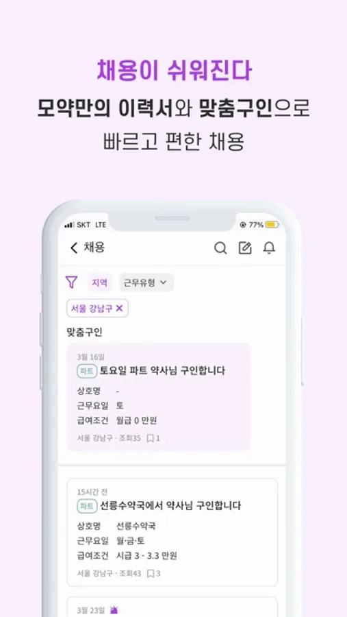 - 자체 메시지 기능을 통해 편리한 구인구직이 가능해요.