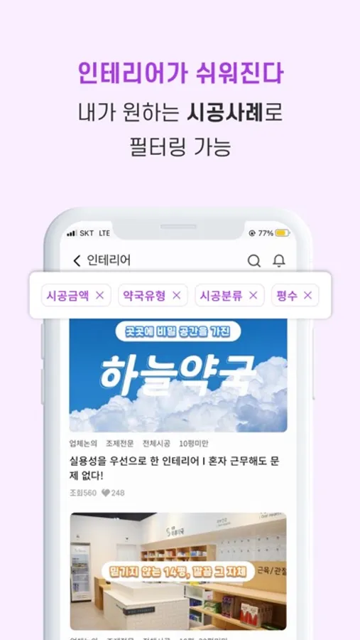 - 다양한 조건으로 필터를 걸어 내가 원하는 약국 인테리어를 모아 볼 수 있어요.