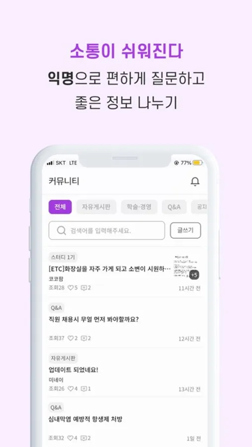 - 닉네임 사용으로 익명성 보장 편하게 소통할 수 있어요.