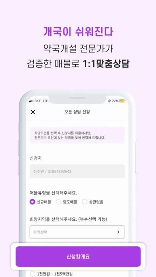 - 약국개설 전문가가 검증된 매물만을 가지고 맞춤형 상담을 도와드려요.