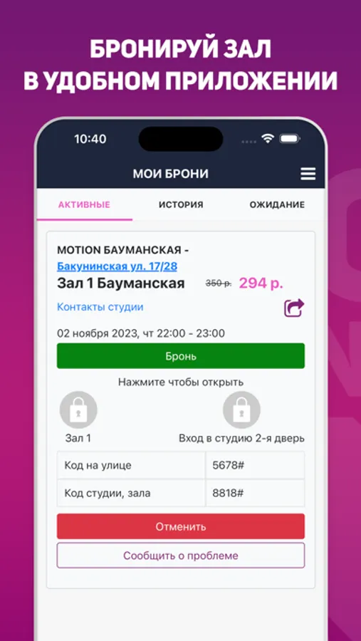 Студия работает с удаленным администратором, Клиенты самостоятельно открывают помещение по кодам указанным в личном кабинете, после совершения бронирования, коды отображаются в разделе «БРОНИ»( 2 кода: 1:вход в здание, 2:вход в студию, раздевалку,зал). Передайте, пожалуйста, код доступа и остальную информацию занимающимся вместе с вами. Если у вас проблемы с доступом — позвоните администратору +7(995)0997083