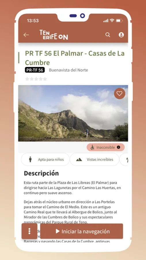 Tenerife ON is the official app of the Tenerife Island Council, providing all the information you need to enjoy outdoor leisure activities on the island. Here you will find a vast network of hiking, cycling and horse riding trails, recreational areas, camping areas and visitor centres, all within the Protected Natural Areas of Tenerife.
