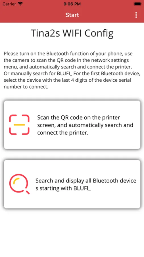 Tina2s Wifi provides two ways to find the 3D printer. First, scan the QR code in the network menu of the 3D printer, identify the serial number of the device, and then search the Bluetooth device corresponding to the serial number. Second, scan and display all names in BLUFI_ First, and then manually select the device you want to connect to.