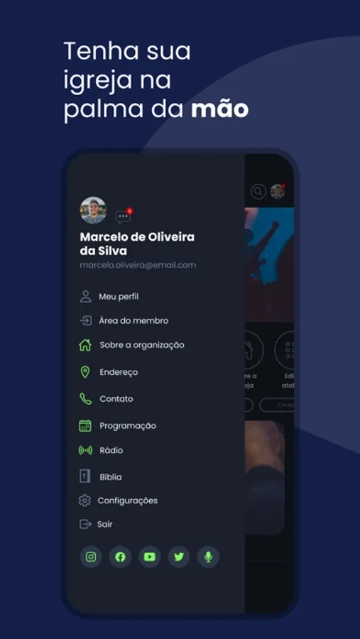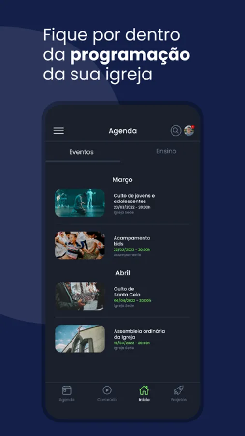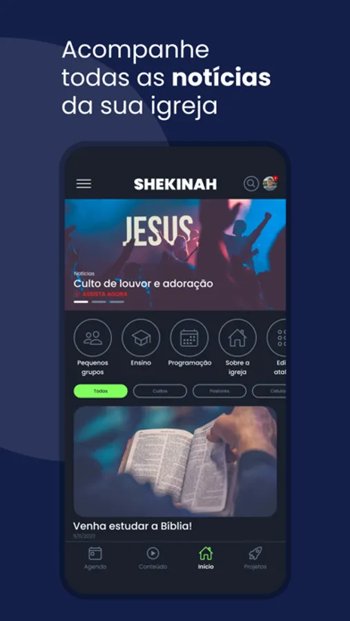 Recursos disponíveis no Aplicativo: Notícias, Agenda da igreja, Eventos, Conteúdos, Projetos, Transmissão ao Vivo e Módulo Ensino.