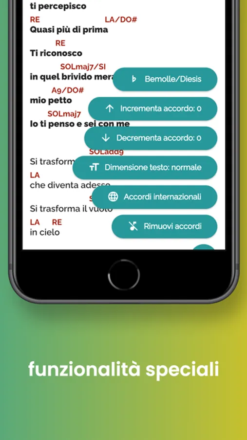 È possibile visualizzare le canzoni con o senza accordi e gli accordi con varie nomenclature.