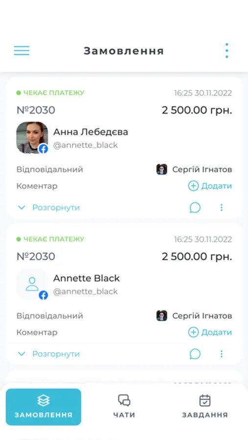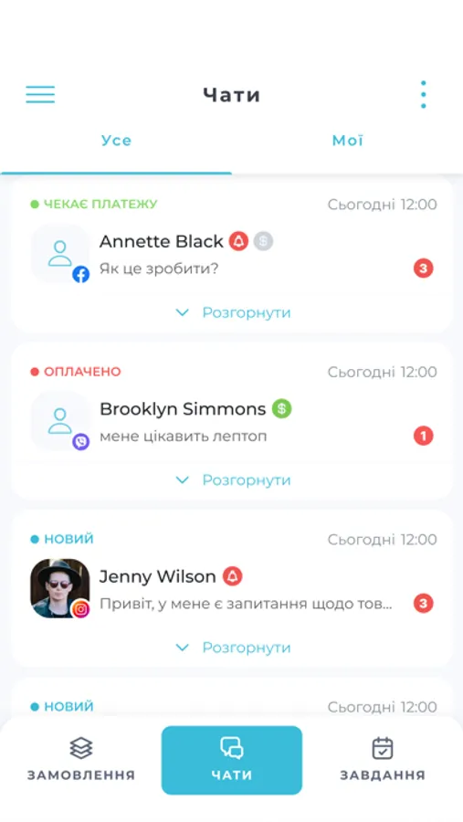 - Усі чати з соц мереж, месенджерів та маркетплейсів в одному місці.