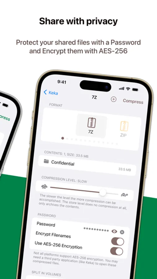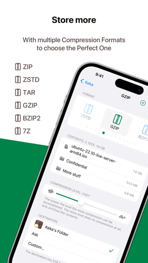 With Keka you can compress as many files as you want in a bunch of formats. You can also encrypt them to store and share securely and with privacy.