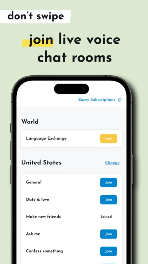 Be yourself in what are you looking for talk and who you'd like to find on Buzzy. Buzzy, only people who match your ideas, the topics you want to talk about, will appear before you. Meet new people whenever where ever.