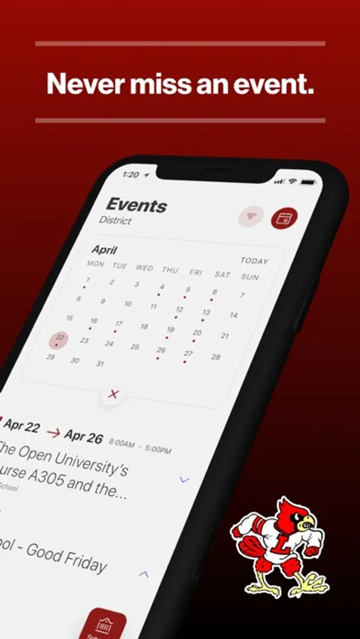 The event section shows a list of events throughout the district. Users can add an event to their calendar to share the event with friends and family with one tap.