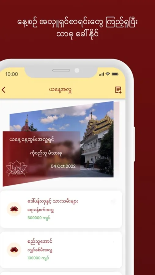 Aung Thukha(Pale) Dhamma Center Application is to provide users with information about Aung Thukha(Pale) Dhamma Center where users can apply their meditation practices record and also view donation records.