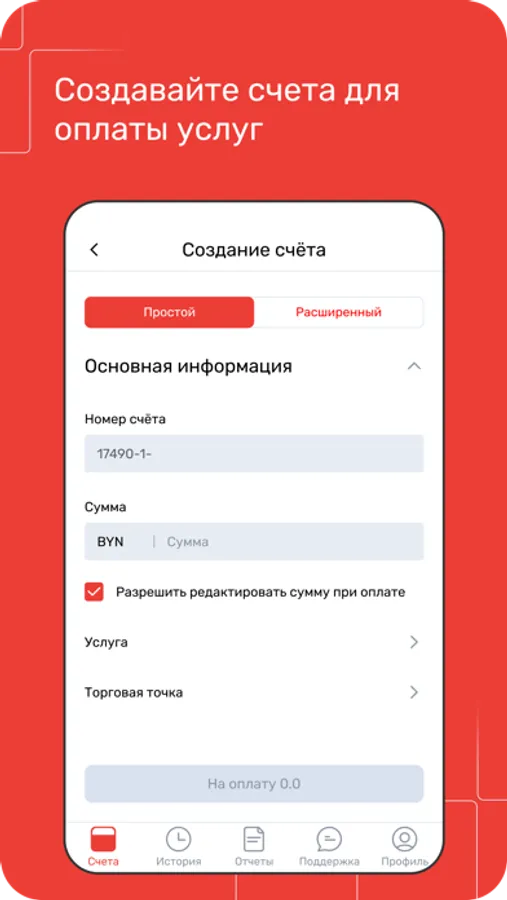- Быстрое выставление счетов в приложении EPOS - достаточно ввести номер счёта, сумму к оплате и нажать кнопку «На оплату»