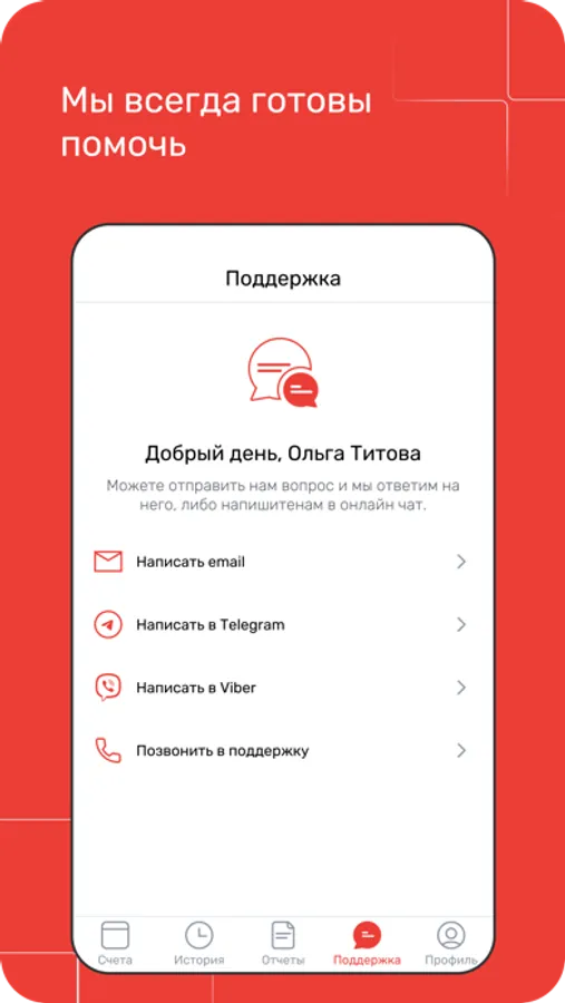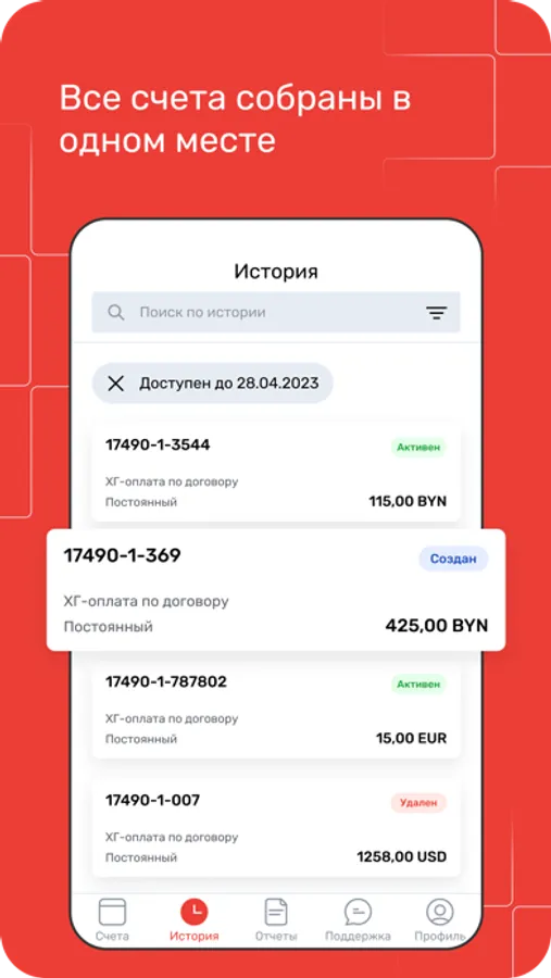 - Просмотр истории оплаченных счетов (удобное разделение в списке по датам оплаты)