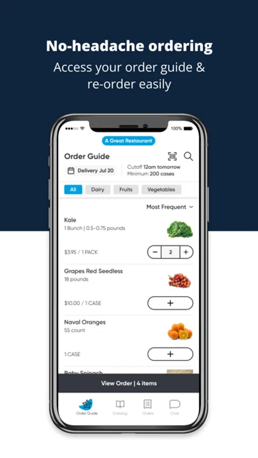 Our mobile app lets you search our complete product catalog, manage and update your ordering guide, and buy what you need at the moment you need it. It’s part of our commitment to giving you an ordering experience you’ll love.