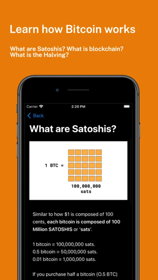 Not sure what any of the above means? The app has a learning component that breaks down each of the above so you can learn about how Bitcoin works. Topics include: