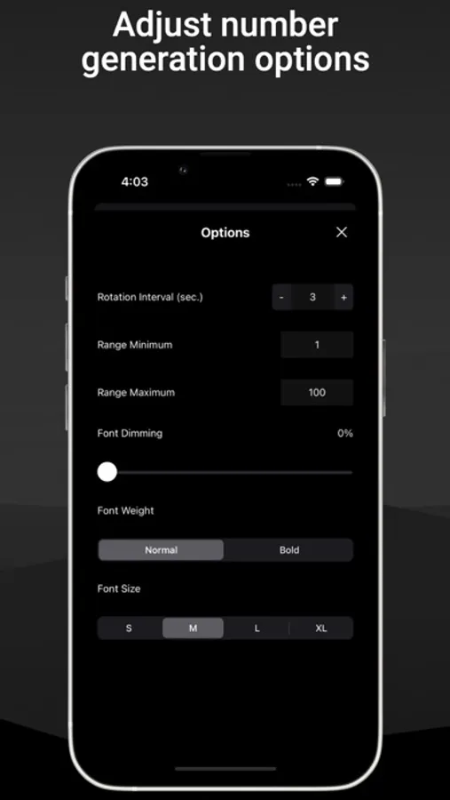 Touch the menu icon in the upper right to adjust the number range, the timing interval, and font size, weight & dimming.