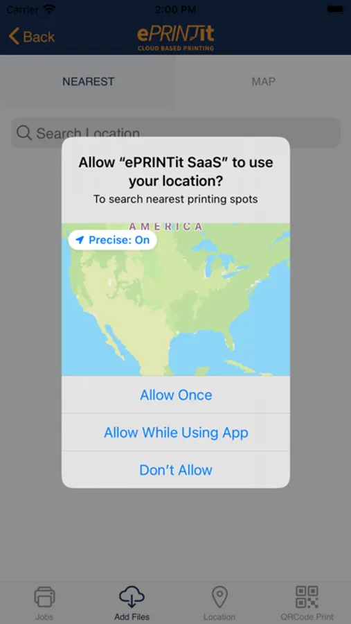 2. For ePRINTit SaaS Print Locations, use the app’s built-in geo-location feature to search for and select a location, or, refine the search by entering keywords in the search bar.