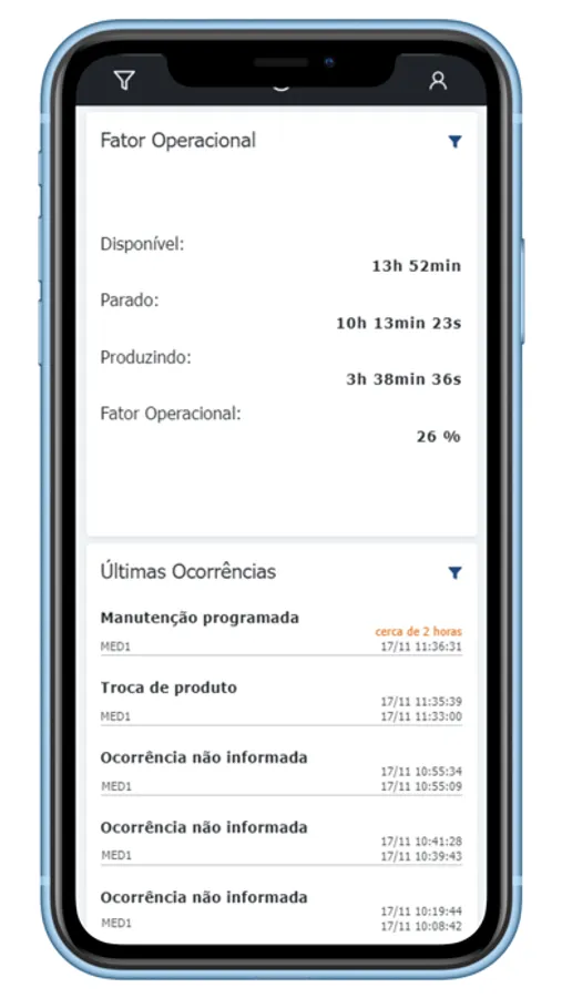 Últimas Ocorrências: exibe o tempo acumulado de parada associado as últimas ocorrências de parada das máquinas registradas;