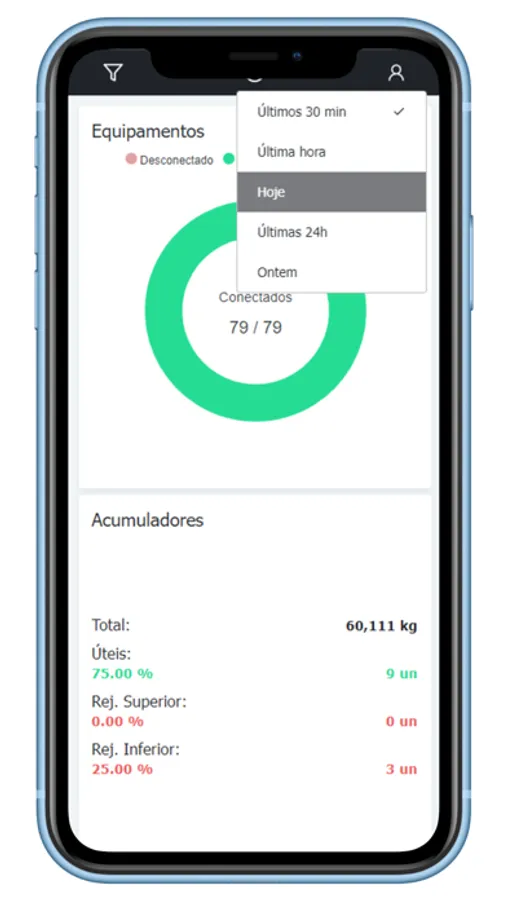 Acumuladores: produção total em peso, produção total dos pacotes úteis, rejeitados inferior e rejeitados superior em número de pesagens;