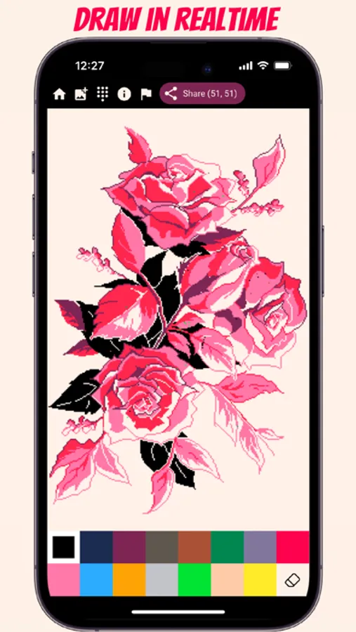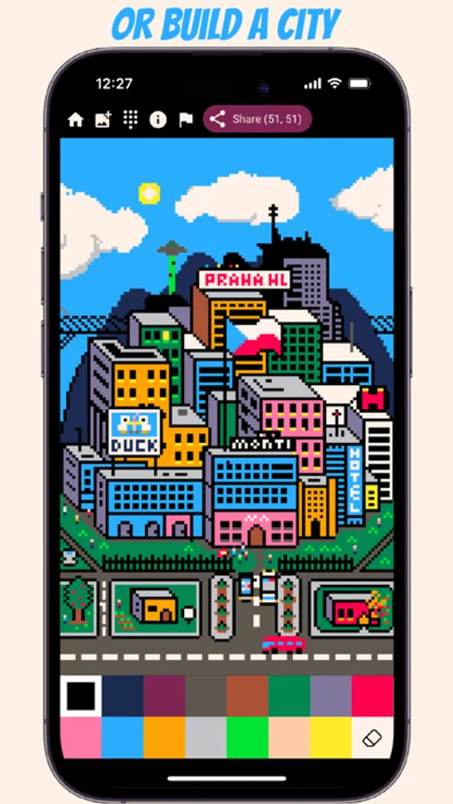 Unlike other pixel art drawing apps, Everyone Draw has no limits! Zoom out and pan as far as you want in any direction on this vast, limitless canvas. You’ll stumble upon thousands of other drawings along the way.