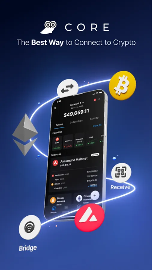Core is the all-in-one command center for all things crypto, supporting Avalanche, Bitcoin, Ethereum, and all EVM-compatible blockchains. Swap and bridge crypto. Collect NFTs and show them off. Access a vast world of decentralized applications (dApps) like games, decentralized finance (DeFi), and digital collectibles.