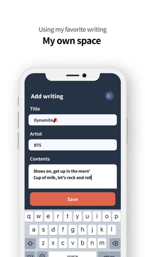 Type with your favorite texts, such as song lyrics, movie quotes, and famous sayings, by adding them to the app.