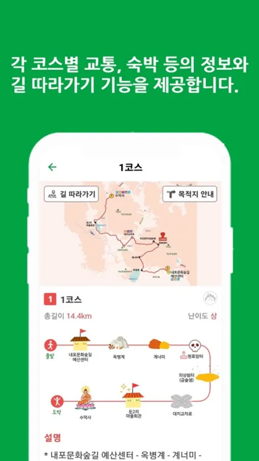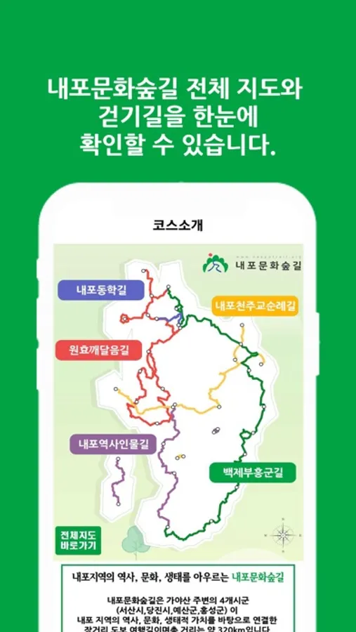 내포문화숲길은 가야산 주변의 4개시군 (서산시,당진시,홍선군,예산군) 이 내포 지역의 역사, 문화, 생태적 가치를 바탕으로 연결한 장거리 도보 여행길이며총 거리는 약 320km입니다.