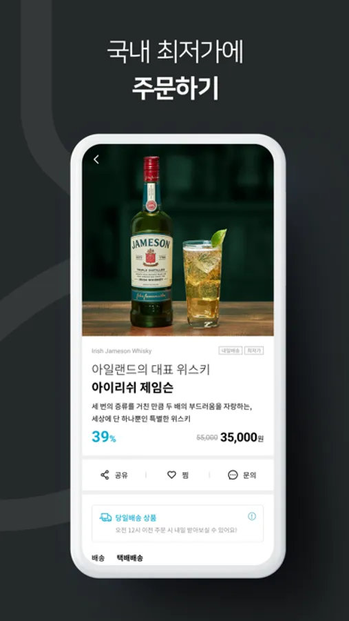 위스키, 와인, 데낄라, 럼, 진, 보드카, 전통주 등 2000여종의 다양한 술들을 집에서 전국 최저가에 주문하고 쇼핑할 수 있는 편리한 중개 구매 어플리케이션 입니다.