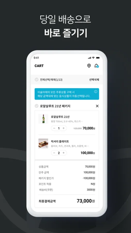 기준에 맞는 금액 내의 안주를 함께 구매하면 직접 집으로도 배송 받으실 수 있습니다.