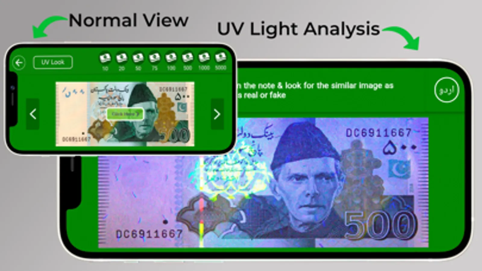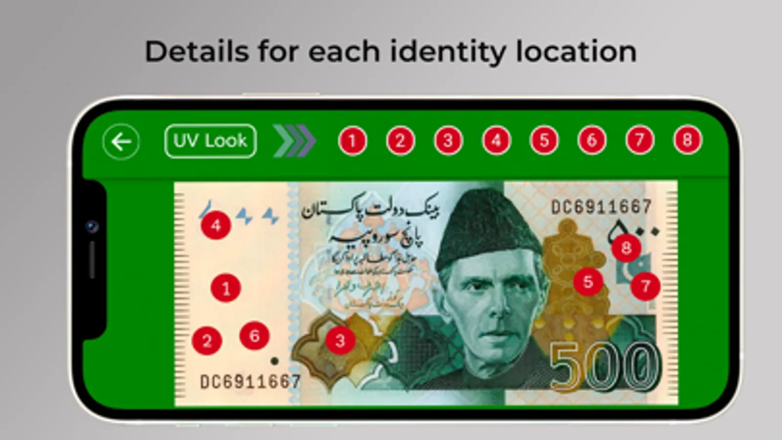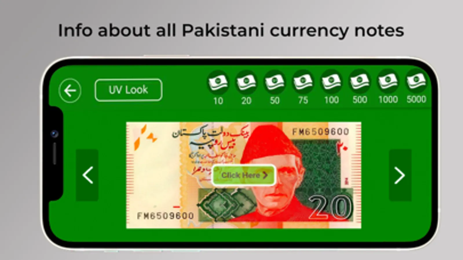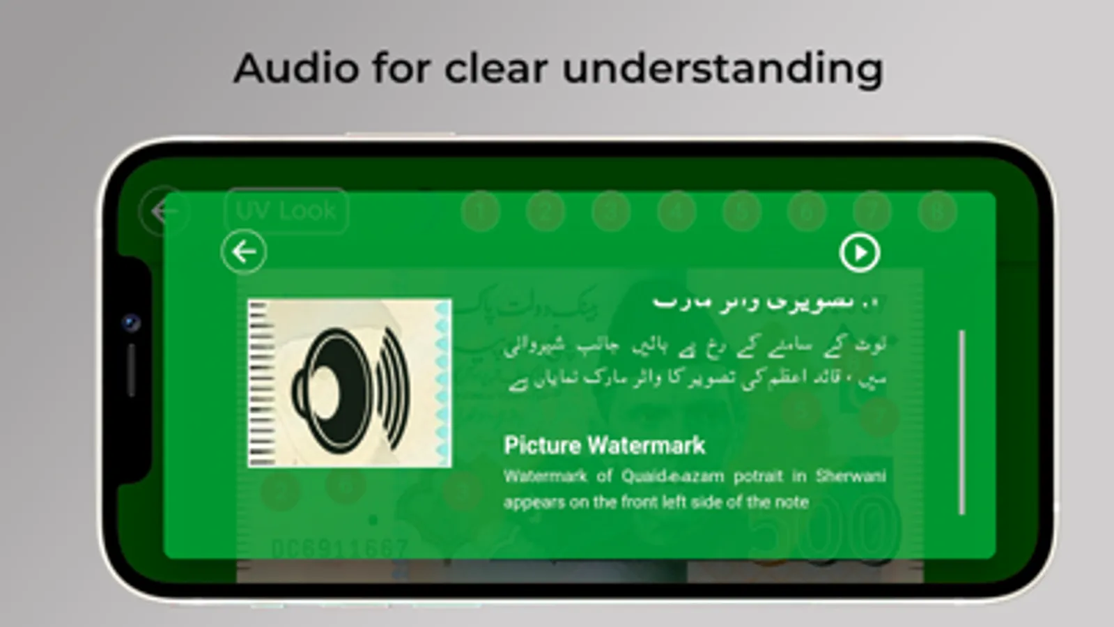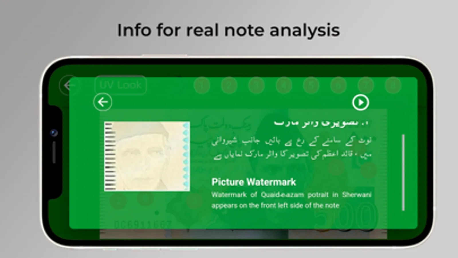 The core feature of the app is to provide you a compact information about each Pakistani note. The app provides the information distinctively of each currency note & foreign exchange. It's a complete guideline to understand the Pakistani Currency notes for everyone especially foreign exchange, currency converter companies & exchange rate. You can now increase your knowledge of Pakistani Currency notes of PKR Rs.10, Rs.20, Rs.50, Rs.75, Rs.100, Rs.500, Rs.1000 & Rs.5000 notes. The app enhances the understanding of the user by displaying all the identity marks of each note in a graphical view. These identity marks are important to test the reality of the note. Hence the app shows a graphical visualization of these marks on the note with their placement, text description & audio details. So, now if you have the UV light device, then you can scan & test your Pakistani note without visiting the bank. The user may click on the mark on the currency or select the mark number from the top list to view the information regarding its originality. Moreover the app permits the user to view the information in Urdu and English. Additionally, the user can also listen to the audio description of Pakistani currency for clear details.