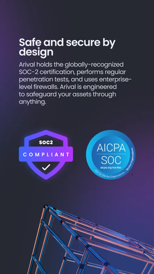 We use 2-Factor Authentication, advanced encryption and perform regular system reviews to keep your data secure. Our safety system is SOC2 compliant, 256 Bit encrypted, and monitored, which means your assets are always safe with Arival Bank.