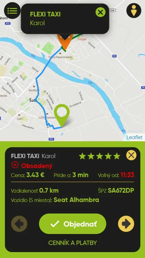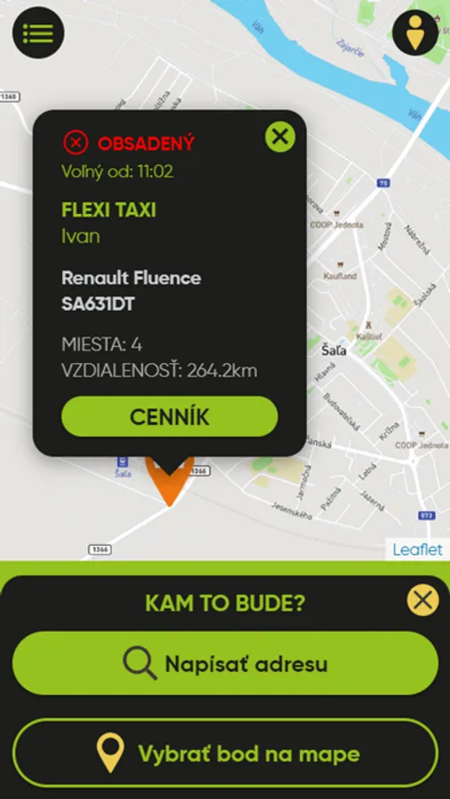 Automatizovaná platforma online dispečingu v meste Šaľa. Vždy vidíte aktuálne voľné vozidlo aj cenu jazdného vopred.