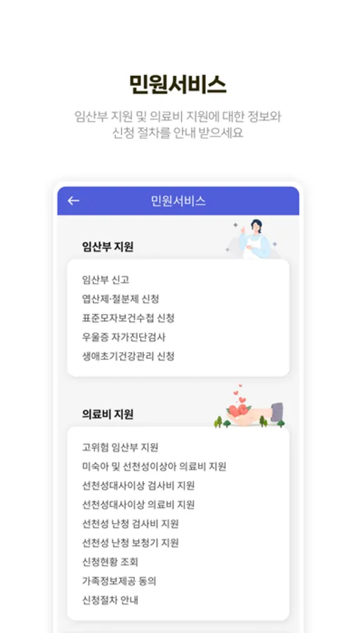 * 임산부 지원 / 의료비 지원 : 보건소로 온라인 임신신고를 한 후 산전, 산후 관리를 지원받을 실 수 있는 서비스입니다.