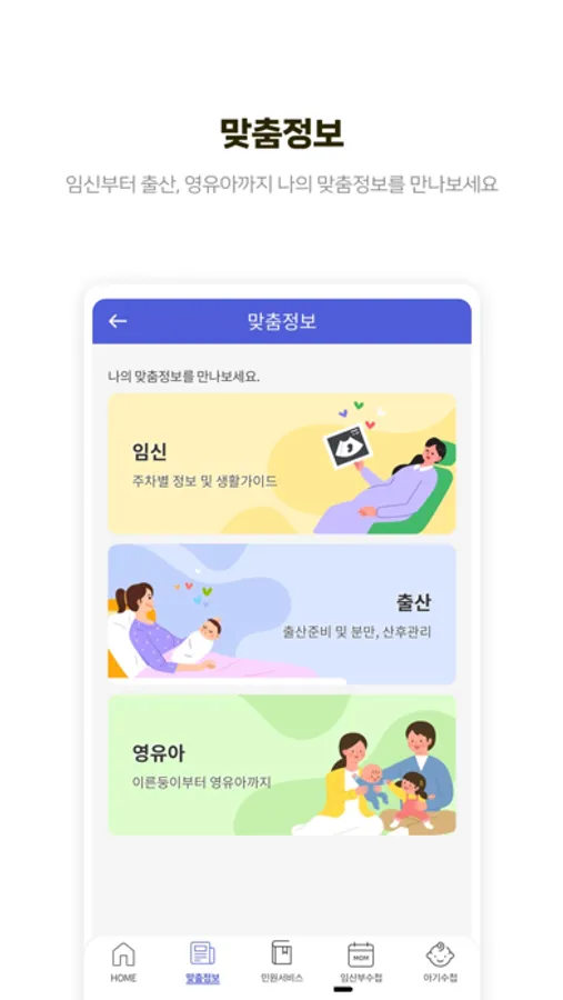 * 맞춤정보 : 임신, 출산, 육아, 정보를 제공하고 가입 및 로그인한 사용자에게 맞춤 정보를 제공하는 서비스입니다.