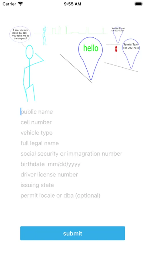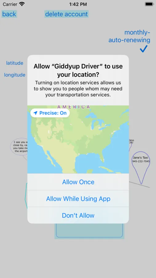 App gathers driver location, cell number, vehicle type, and information for companion app(giddyup ninja), background checks and vetting.