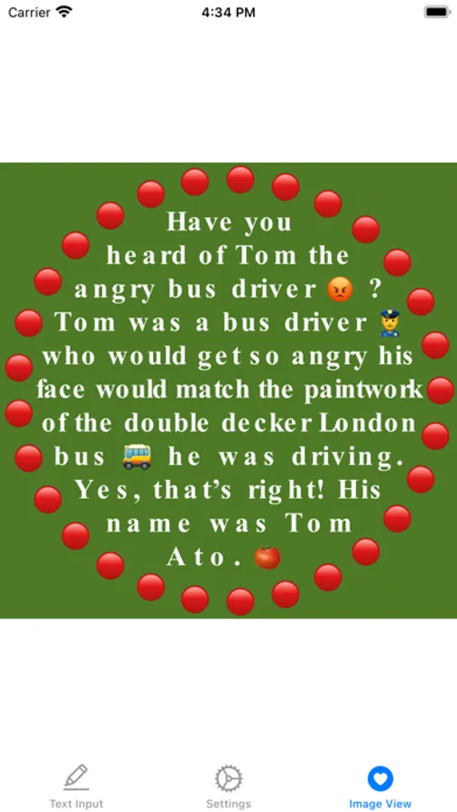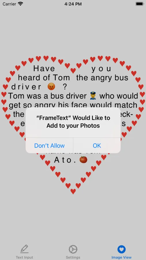 FrameText is an app in which you enter text and on clicking a button, an image is generated with your message surrounded by a frame of small equidistant symbols or emojis. Frame is either heart, square or circle shaped. This image can then be used on any social media.