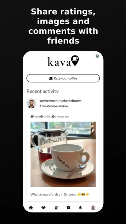 Rate the coffees you drink and share images, comments, and likes with your followers. Follow your friends around the world and see what coffees they're drinking.
