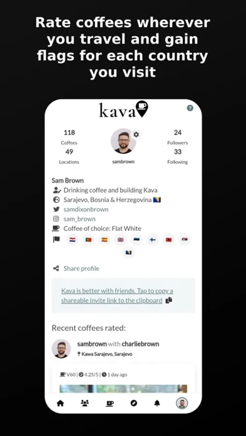 Make going out for coffee (even more) fun by earning badges for each country you visit and watch your coffee count climb.